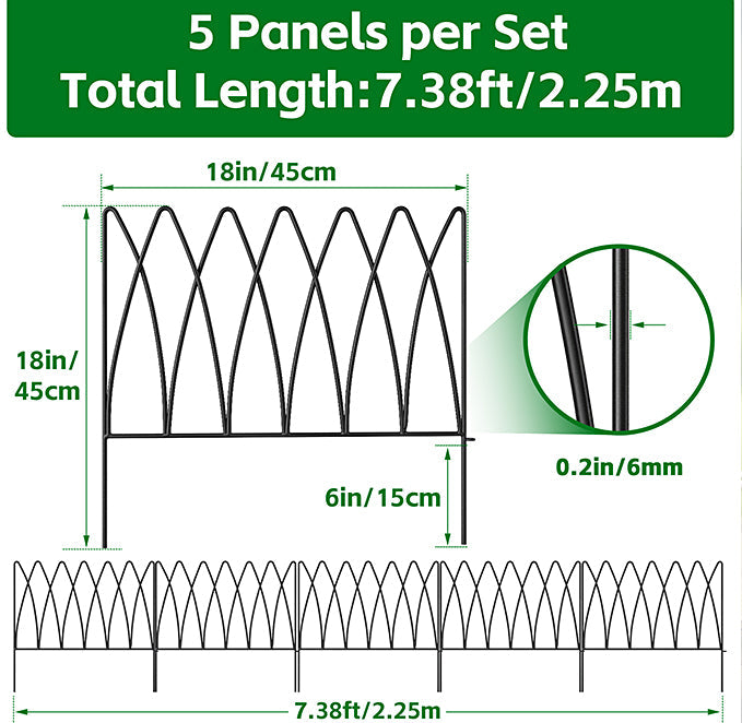 Decorative Metal Garden Fence 45cm x 45cm (5 Panels, Total Length 2.3m), Metal Fence Panels for Flower Bed, Trees, Animal Barrier