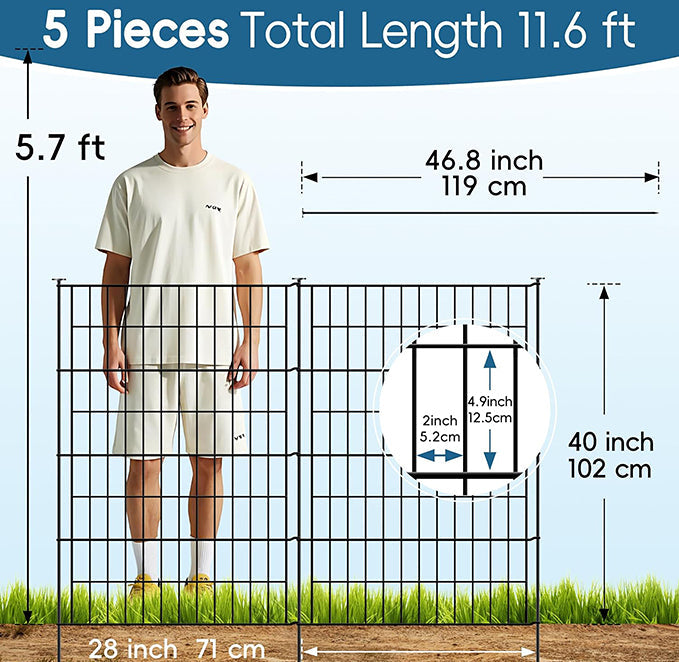 This set includes 4 fence panels plus a gate. Each panel stands 32 inches (81 cm) tall and 28 inches (71 cm) wide, giving you a total run of about 11.5 ft (3.5 m) once everything’s connected. The panels slot together using metal stakes, which stand 39 inches (101 cm) high. There’s also a handy gate latch so you can nip in and out with ease.